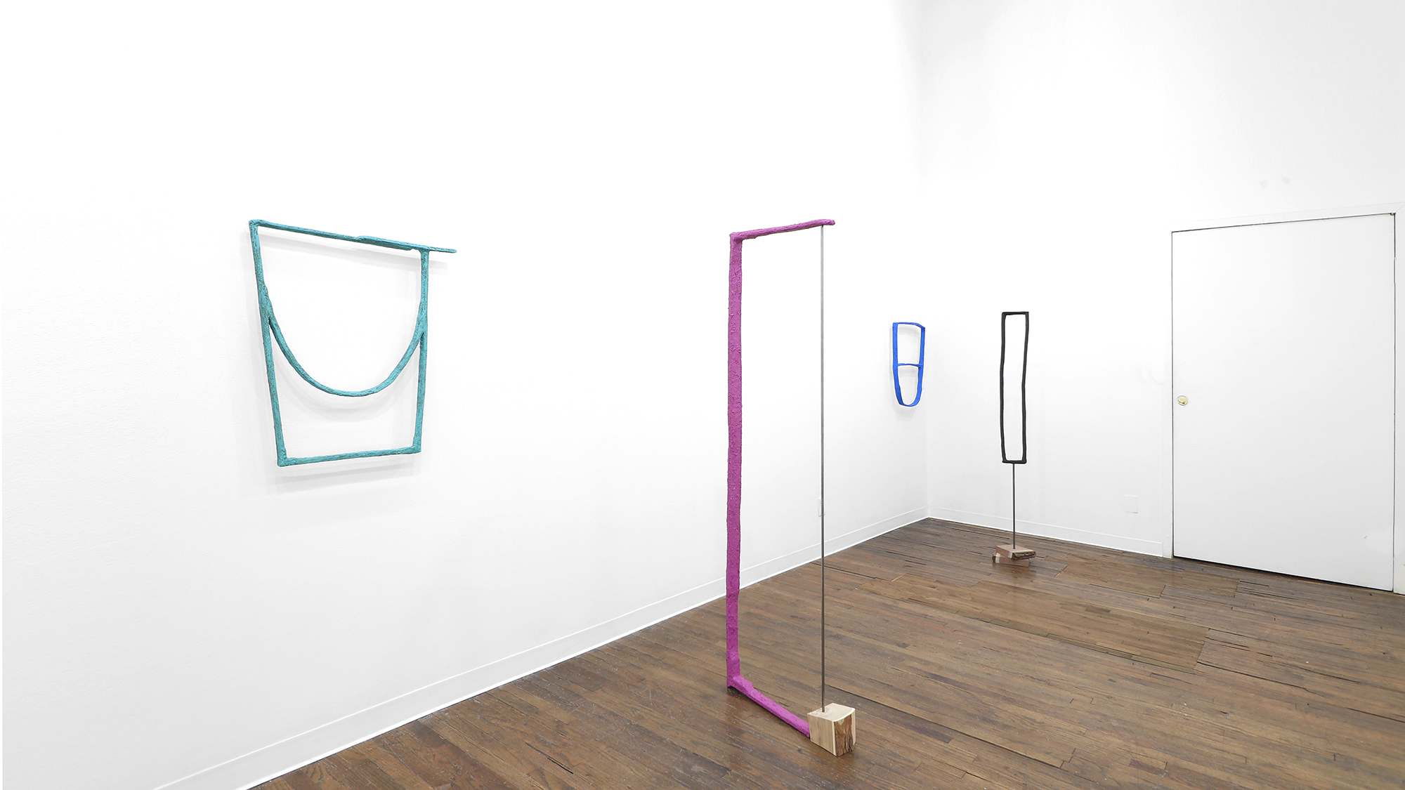 These sculptures also operate as “helping” verbs, verbs linking a subject to a noun or a description. Like the words in the show’s title, the works purposefully point to others in the room, and to the room itself. In this way the pieces slip between verb, subject, object, singular and plural. Modest but multifaceted.