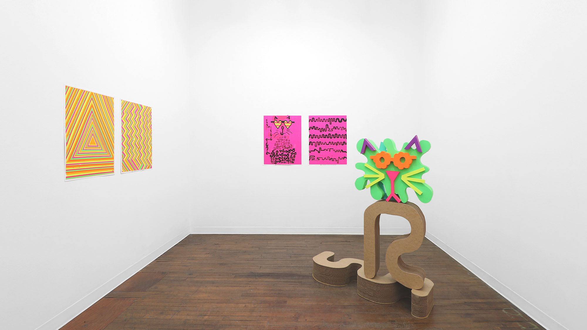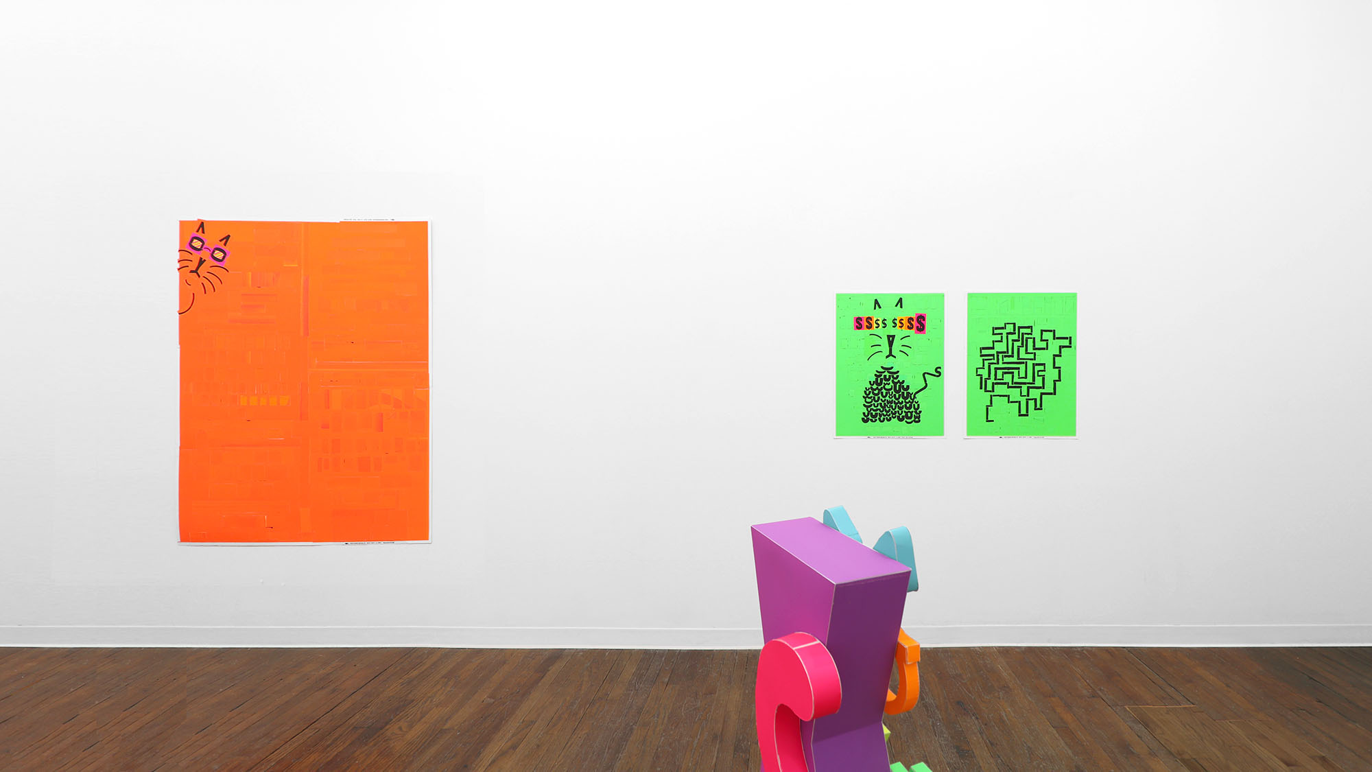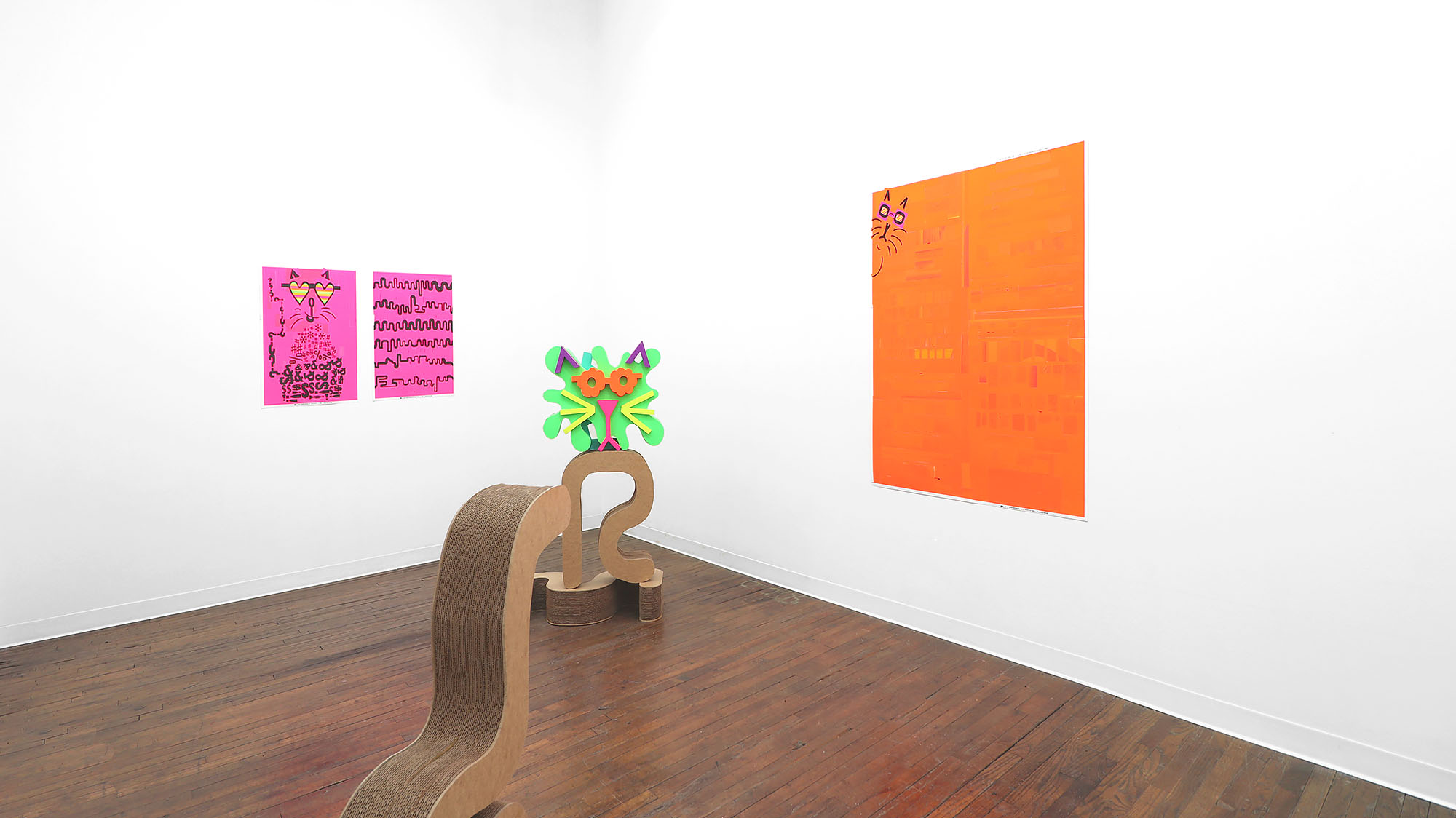 The color palette is expanded through custom silkscreen-printed papers that recreate and subtly extend the Colby palette. In addition to the collages, the exhibition includes a series of colorful paper sculptures of cat heads. Each sculpture is assembled from multiple components—such as sunglasses, ears, whiskers, noses, and mounts—constructed from different colored papers. The heads sit atop laminated cardboard and Masonite bases shaped like exaggerated cat tails, nodding to the undulating forms of Frank Gehry’s Wiggle Chairs from the 1990s.