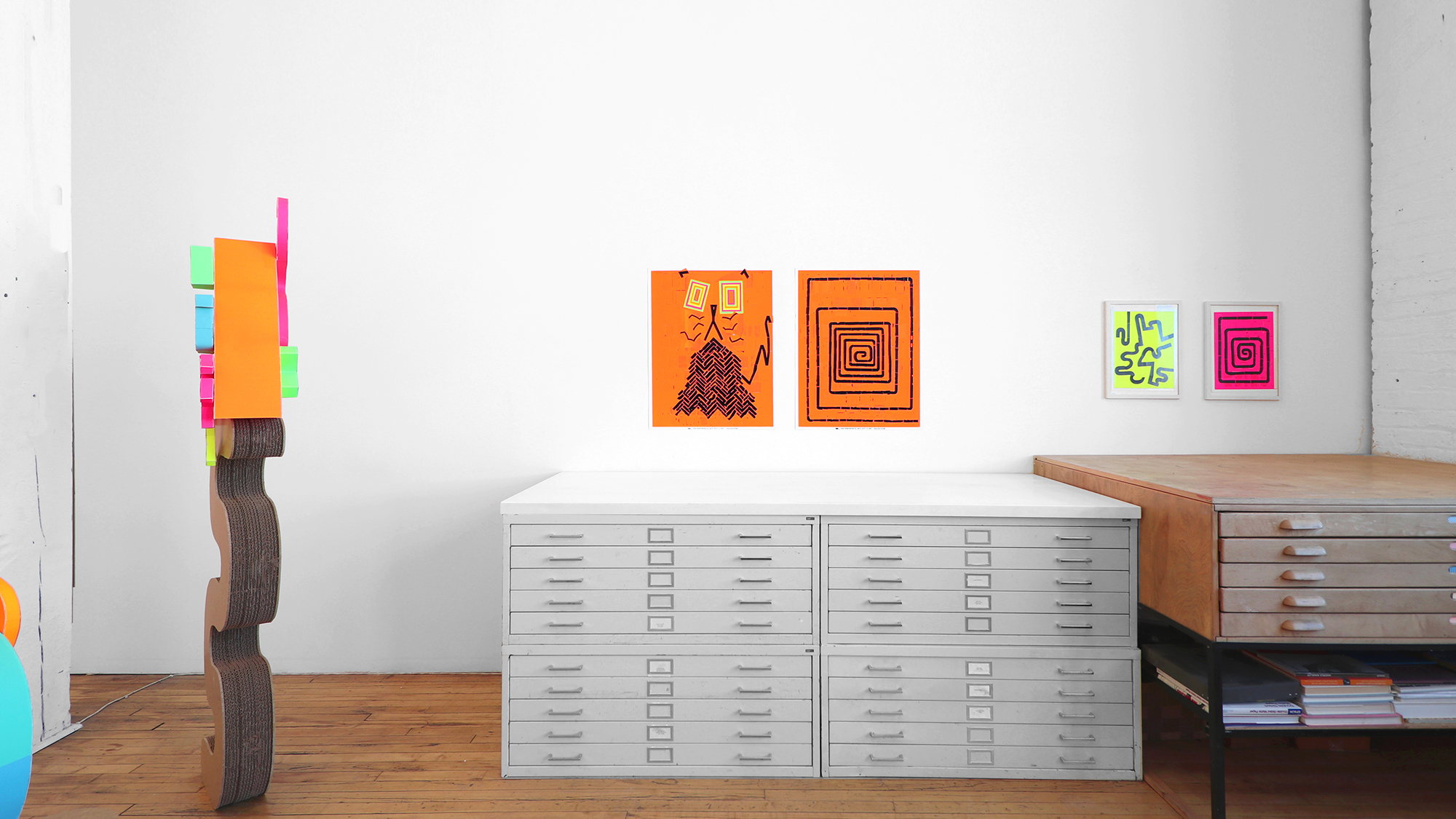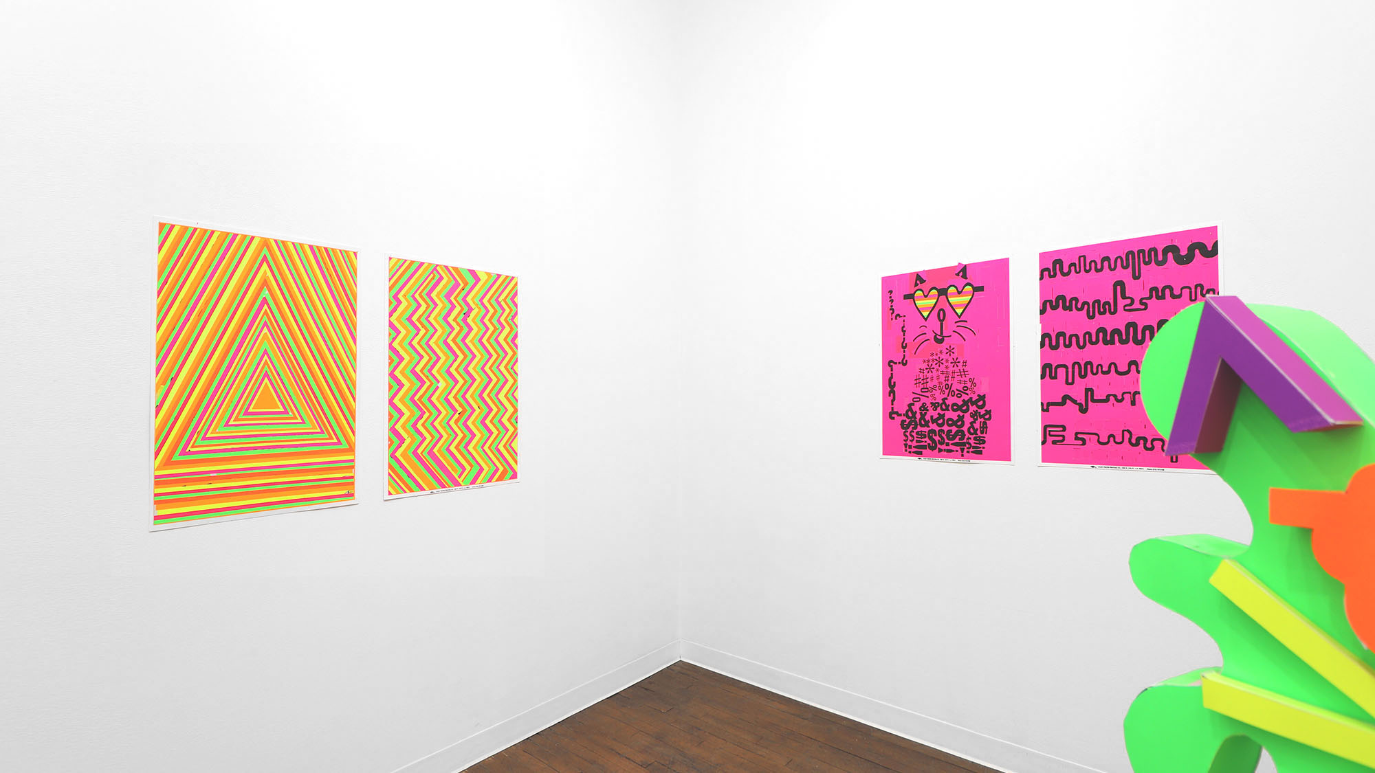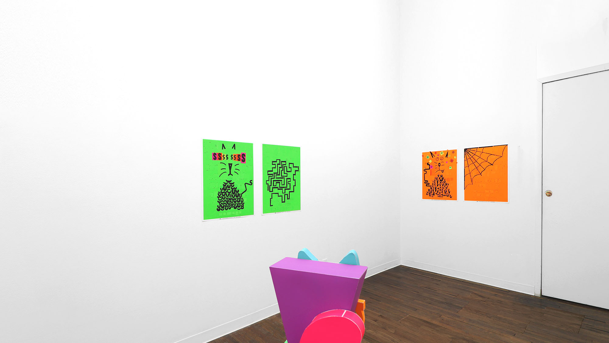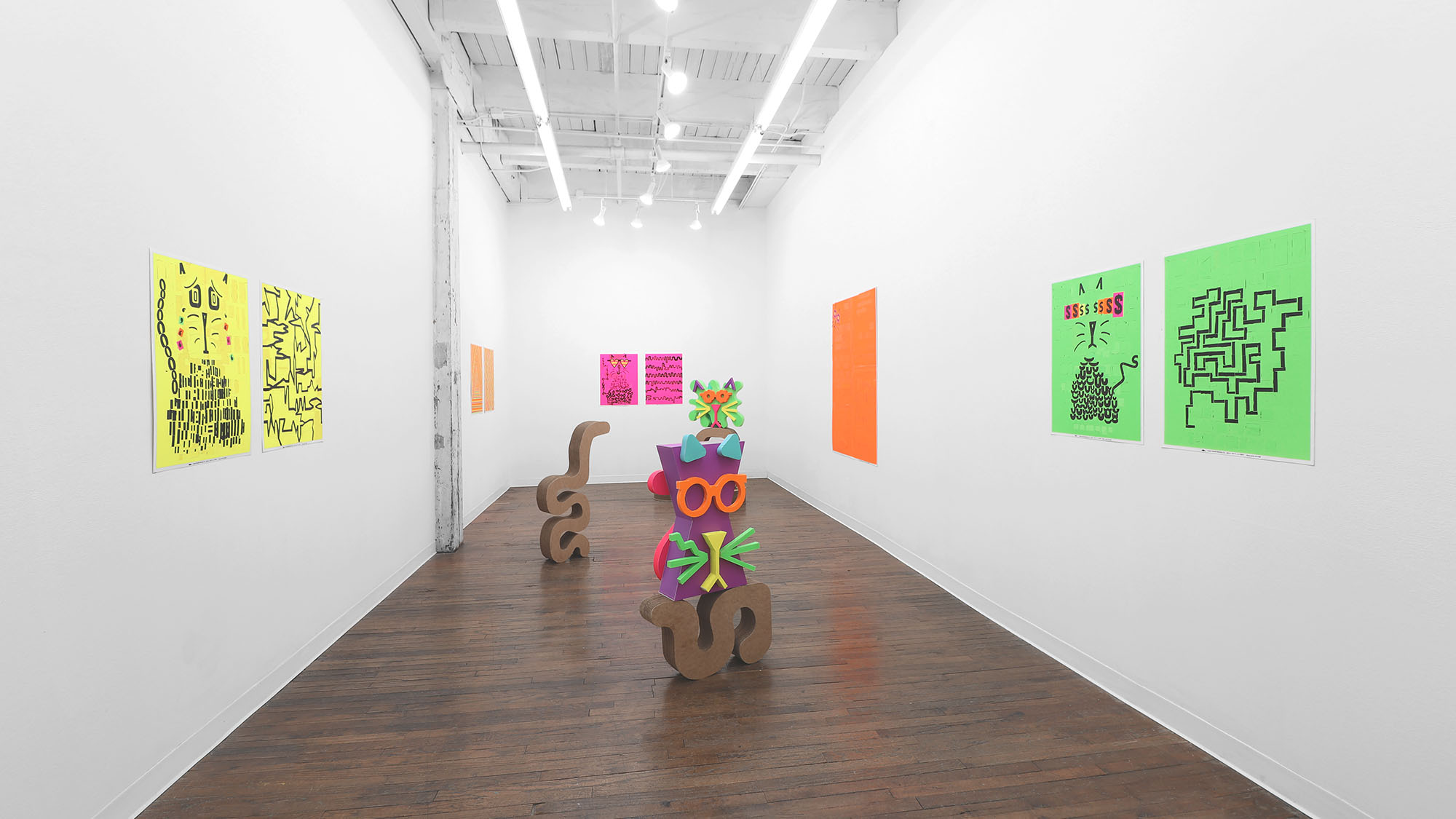 The color palette is expanded through custom silkscreen-printed papers that recreate and subtly extend the Colby palette. In addition to the collages, the exhibition includes a series of colorful paper sculptures of cat heads. Each sculpture is assembled from multiple components—such as sunglasses, ears, whiskers, noses, and mounts—constructed from different colored papers. The heads sit atop laminated cardboard and Masonite bases shaped like exaggerated cat tails, nodding to the undulating forms of Frank Gehry’s Wiggle Chairs from the 1990s.