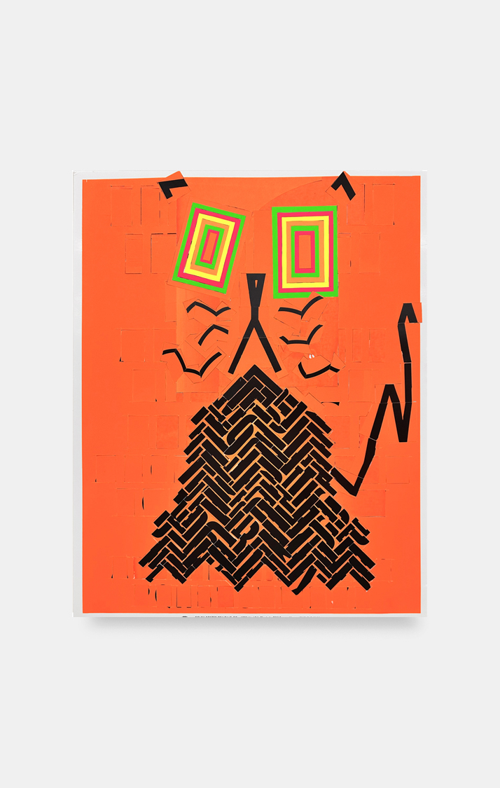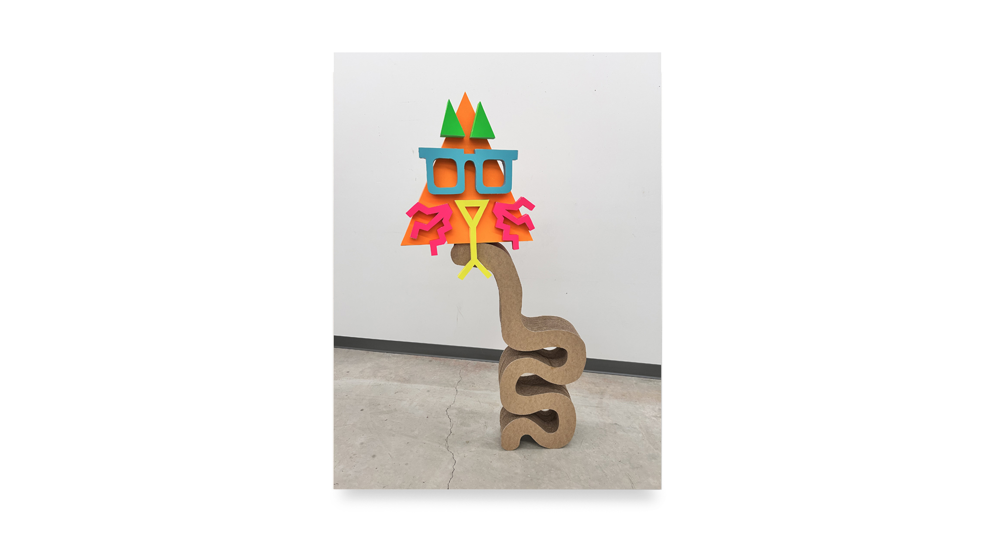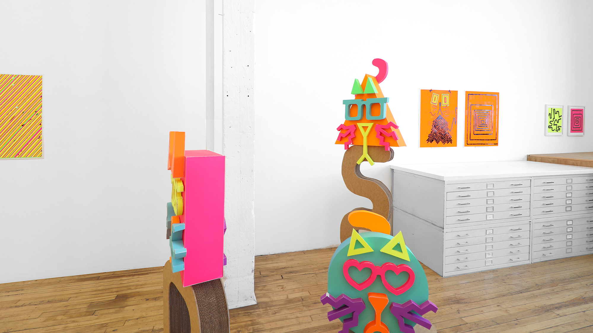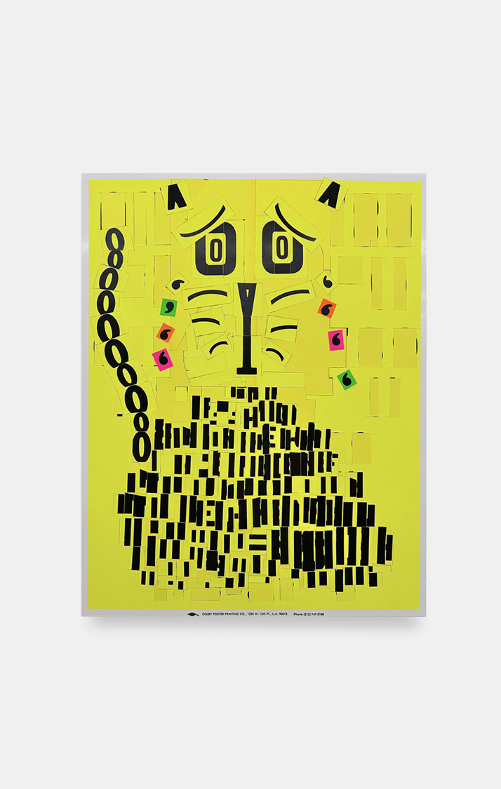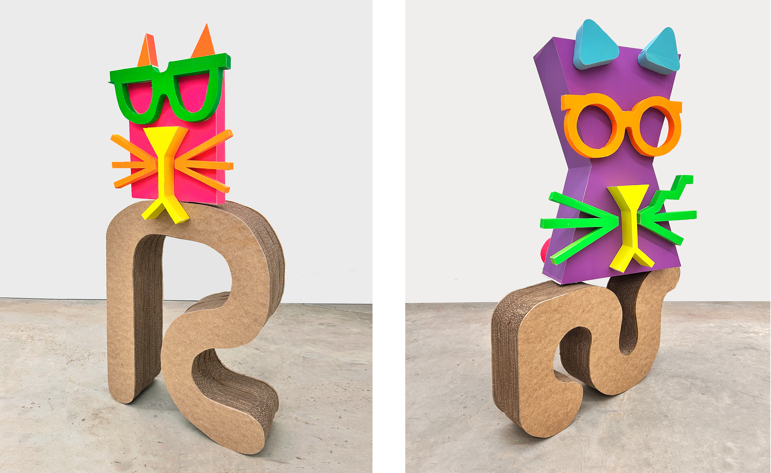 The color palette is expanded through custom silkscreen-printed papers that recreate and subtly extend the Colby palette. In addition to the collages, the exhibition includes a series of colorful paper sculptures of cat heads. Each sculpture is assembled from multiple components—such as sunglasses, ears, whiskers, noses, and mounts—constructed from different colored papers. The heads sit atop laminated cardboard and Masonite bases shaped like exaggerated cat tails, nodding to the undulating forms of Frank Gehry’s Wiggle Chairs from the 1990s.