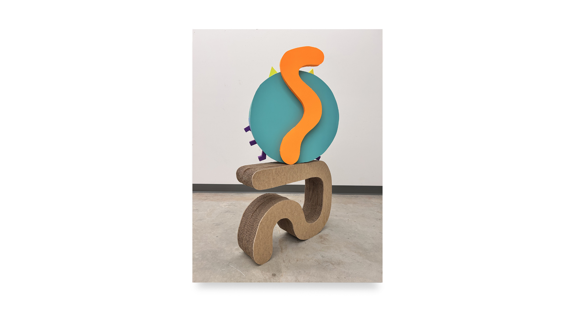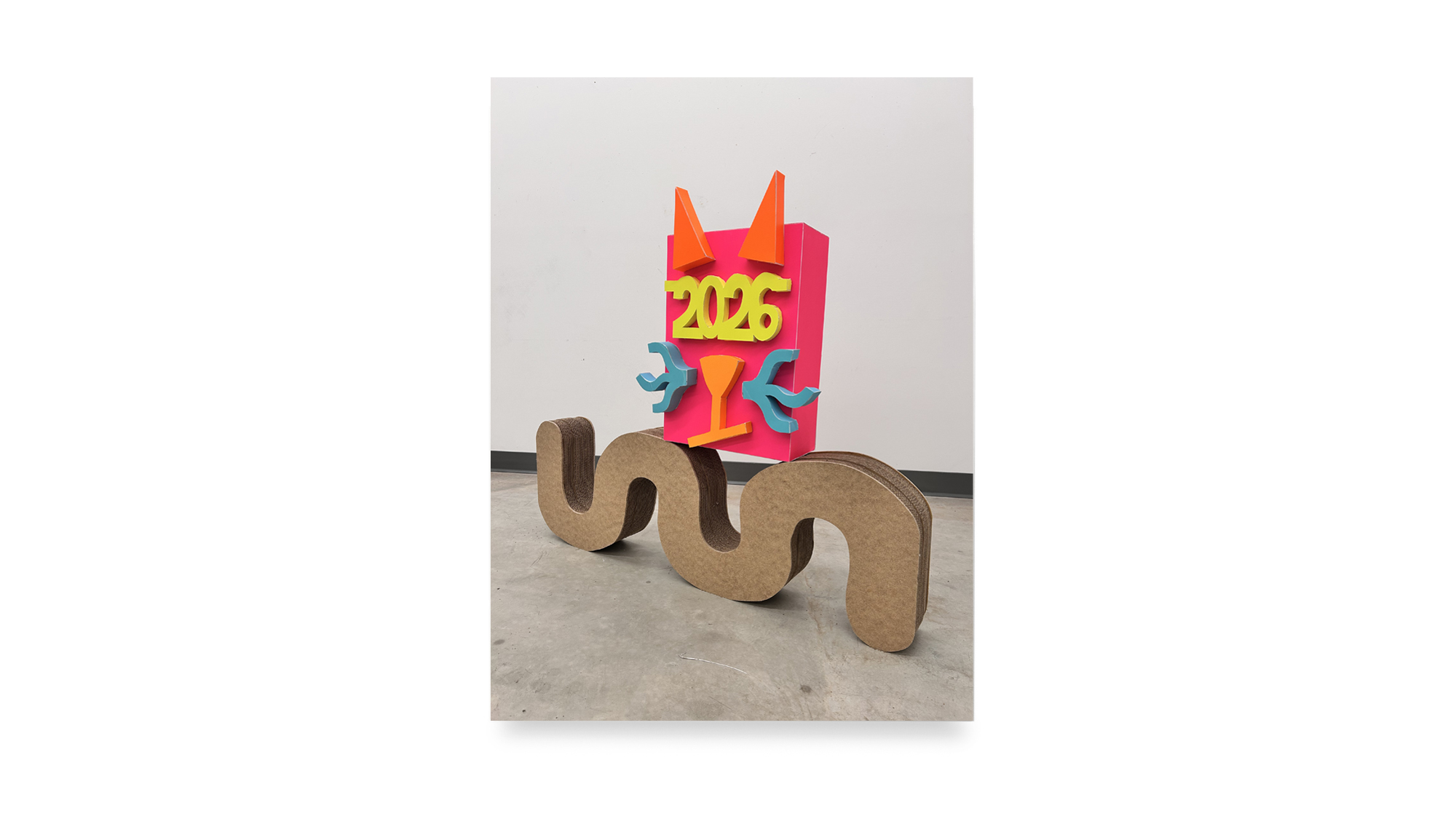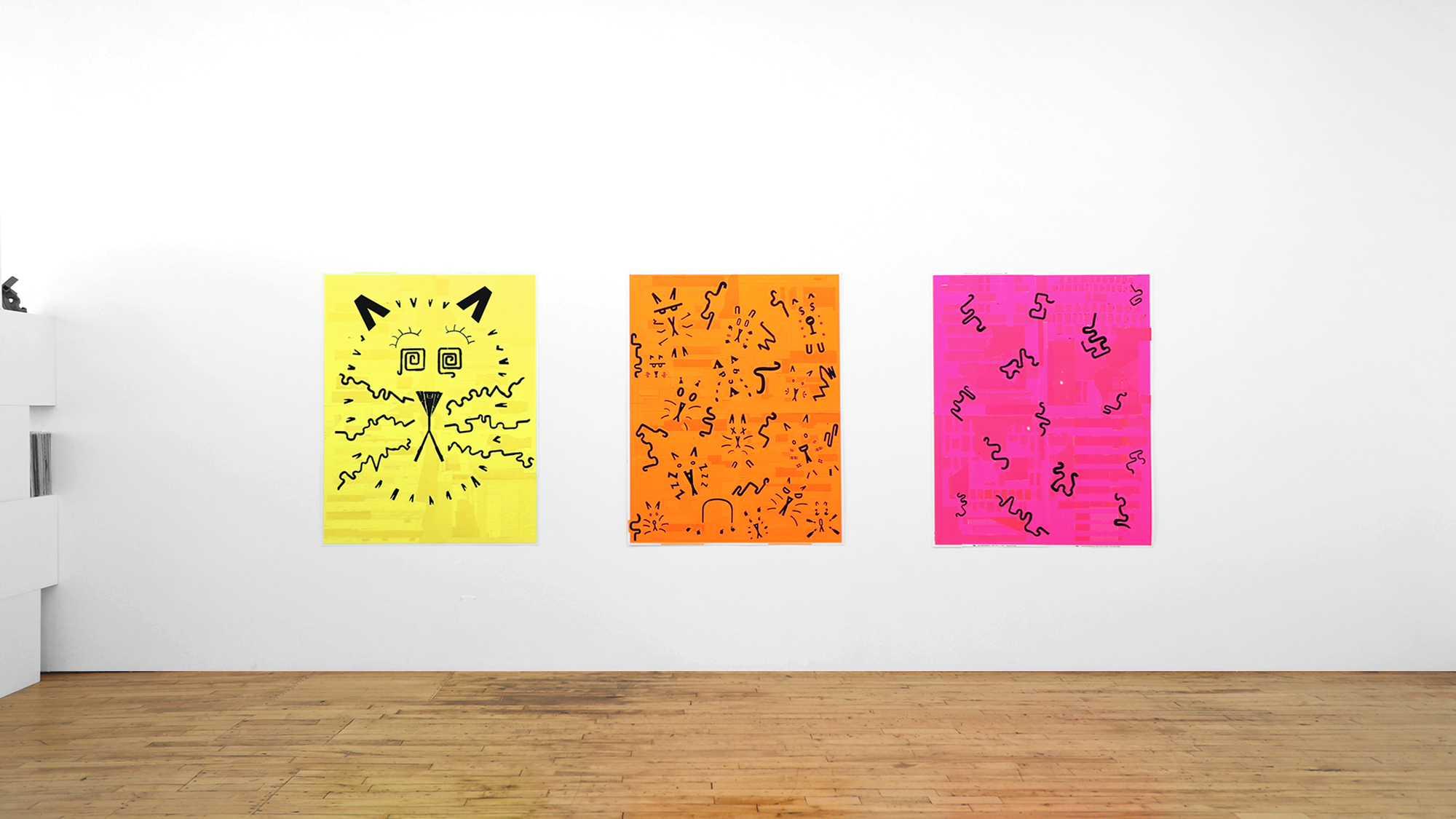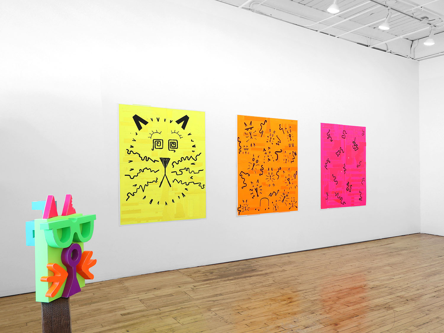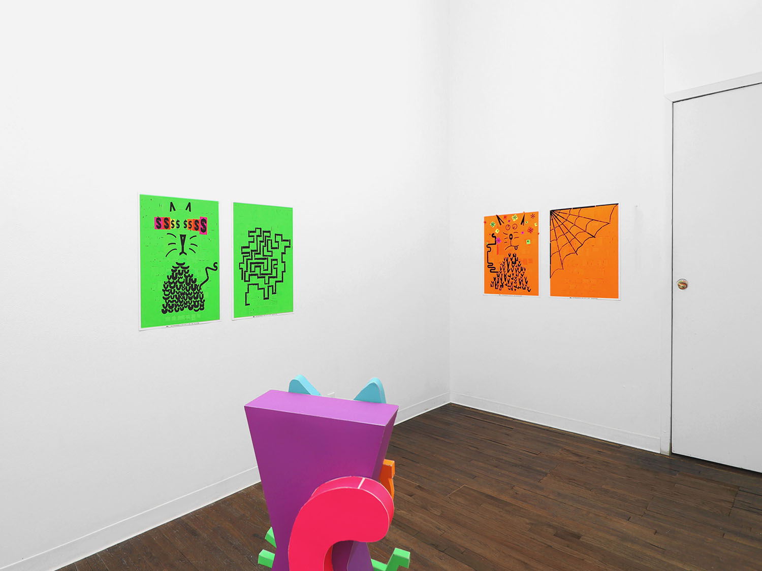 The color palette is expanded through custom silkscreen-printed papers that recreate and subtly extend the Colby palette. In addition to the collages, the exhibition includes a series of colorful paper sculptures of cat heads. Each sculpture is assembled from multiple components—such as sunglasses, ears, whiskers, noses, and mounts—constructed from different colored papers. The heads sit atop laminated cardboard and Masonite bases shaped like exaggerated cat tails, nodding to the undulating forms of Frank Gehry’s Wiggle Chairs from the 1990s.