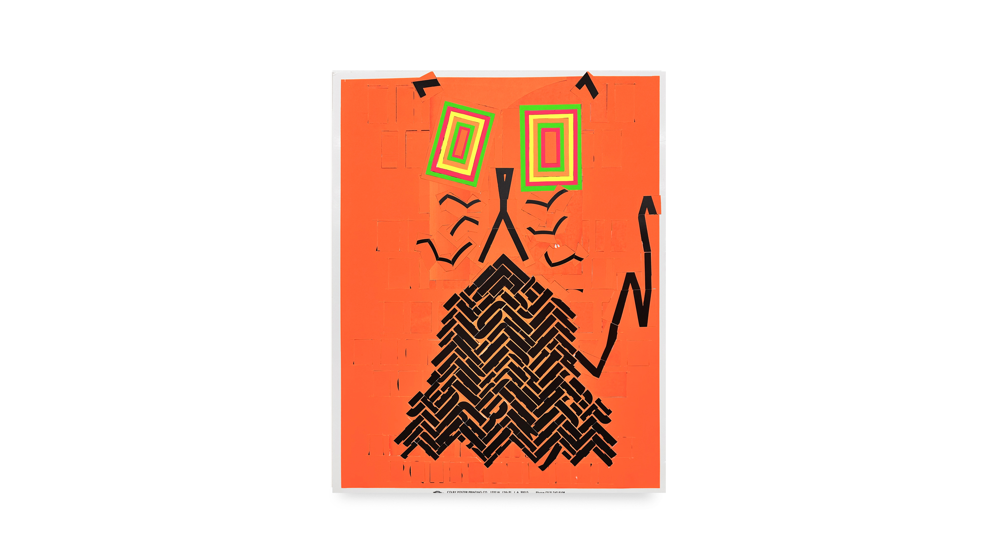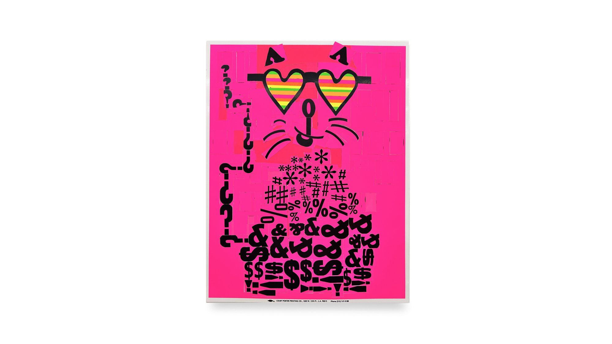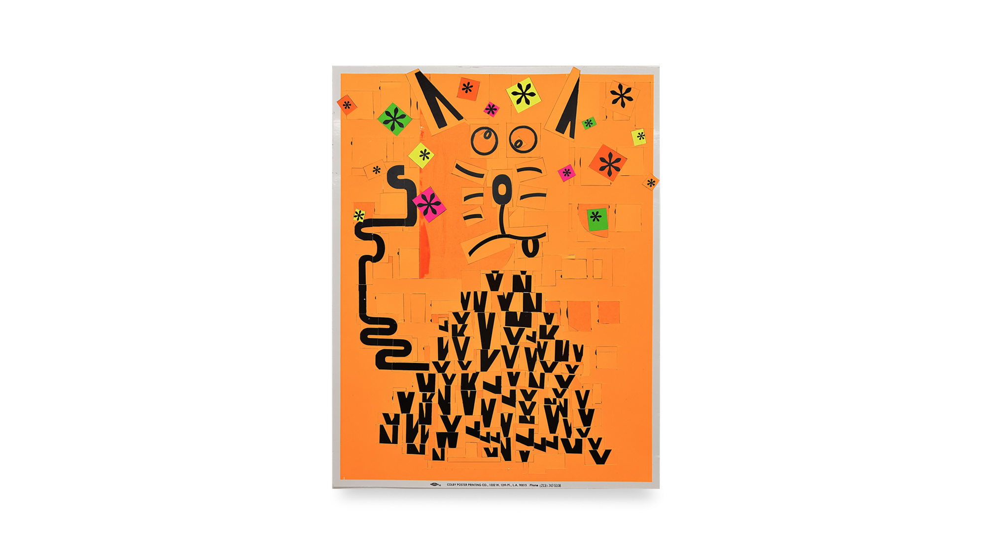 Michlig’s practice often involves cutting apart letterpress posters and recomposing their typographic fragments into new arrangements. For Catalog, this process is focused on cats and uses the Colby posters as the sole source material for the collages. Feline presence is suggested through truncated letters, punctuation, and partial forms set against vivid neon grounds. The cats are not depicted directly but emerge through attitude and compositional gesture.